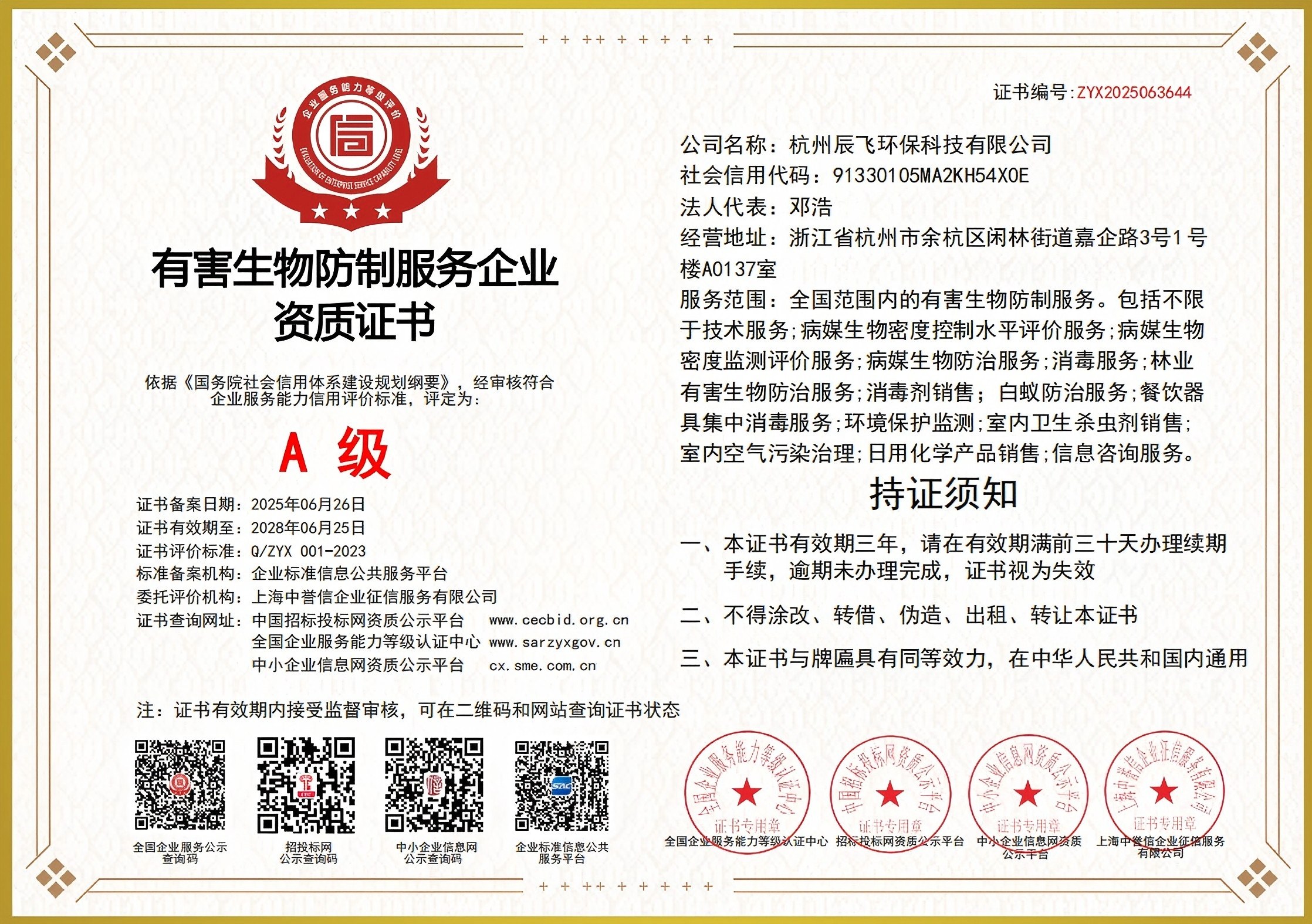 杭州辰飛環??萍加邢薰臼且患覍I的PCO有害生物防治服務機構。是經杭州市工商局注冊登記、杭州市白蟻防治管理所、PCO協會批準的城市害蟲綜合治理消殺公司,是集除四害、白蟻消殺、除蟲、消毒殺菌、室內空氣污染治理、藥械銷售于一體的大型專業杭州有害生物防治科技有限公司。主要從事新建、擴建、改建、裝飾裝修單位建筑物的白蟻防治和白蟻預防工程,同時從事工廠、酒店、企事業單位、住宅小區和家庭的”四害”消殺和白蟻防治服務,長期向各類型客戶提供杭州白蟻消殺、除蟑螂、除老鼠、除蟲、消毒殺菌等優質服務。 本公司自成立以來,秉承“誠信、敬業、高效、務實”的發展原則,以現...